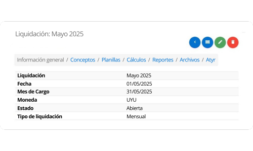 En esta sección se puede acceder a todos los datos generales vinculados a la liquidación de cada trabajador. Incluye los conceptos asignados, las planillas correspondientes, así como los cálculos realizados, reportes generados, documentos asociados y otros elementos relevantes del proceso de liquidación.