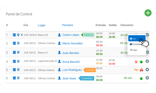 A través de él, puedes mantener un seguimiento detallado de cada integrante, desde su reconocimiento facial hasta sus horarios de trabajo, pausas, e incluso su ubicación precisa durante las labores, modalidad de trabajo, comentarios y más.