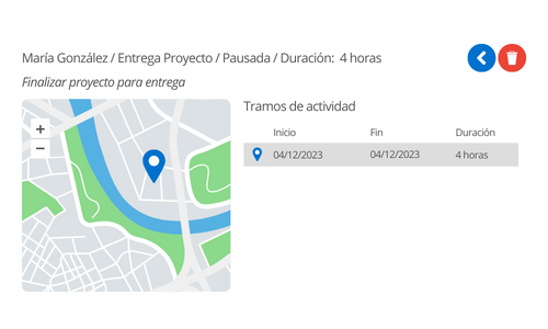 Aquí podrán visualizar la ubicación de la persona encargada de la tarea asignada. Además de obtener detalles sobre la descripción y estado de la tarea, también se tendrá acceso a la fecha de inicio/fin y la duración de la actividad.